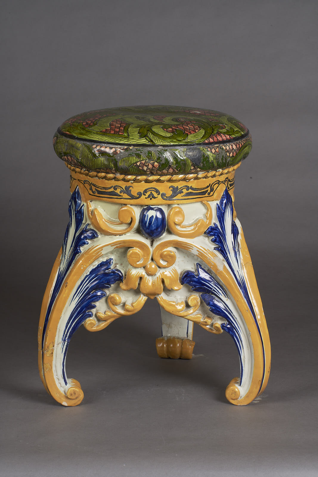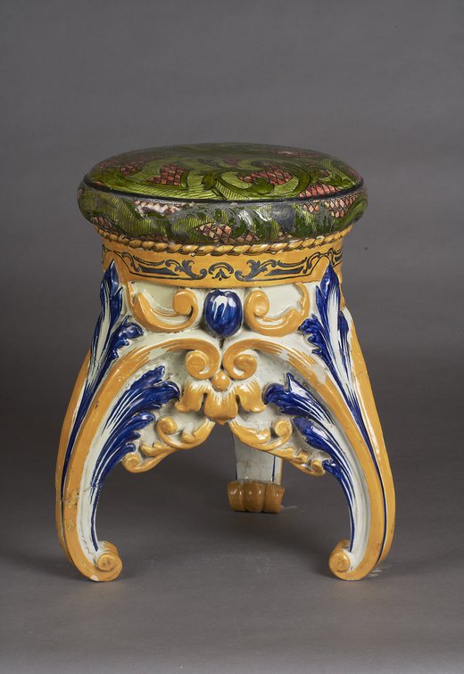 This, however, is not majolica but engobed and varnished terracotta. The surface was first covered with a clay-like layer and fired with the white engobe, after which a glaze or transparent glass coating was applied to protect the surface without altering the adornments and colouring. As well as reducing the porosity of the terracotta, this double coating made it possible to apply drawn or painted decorations thanks to the white ground of the engobe