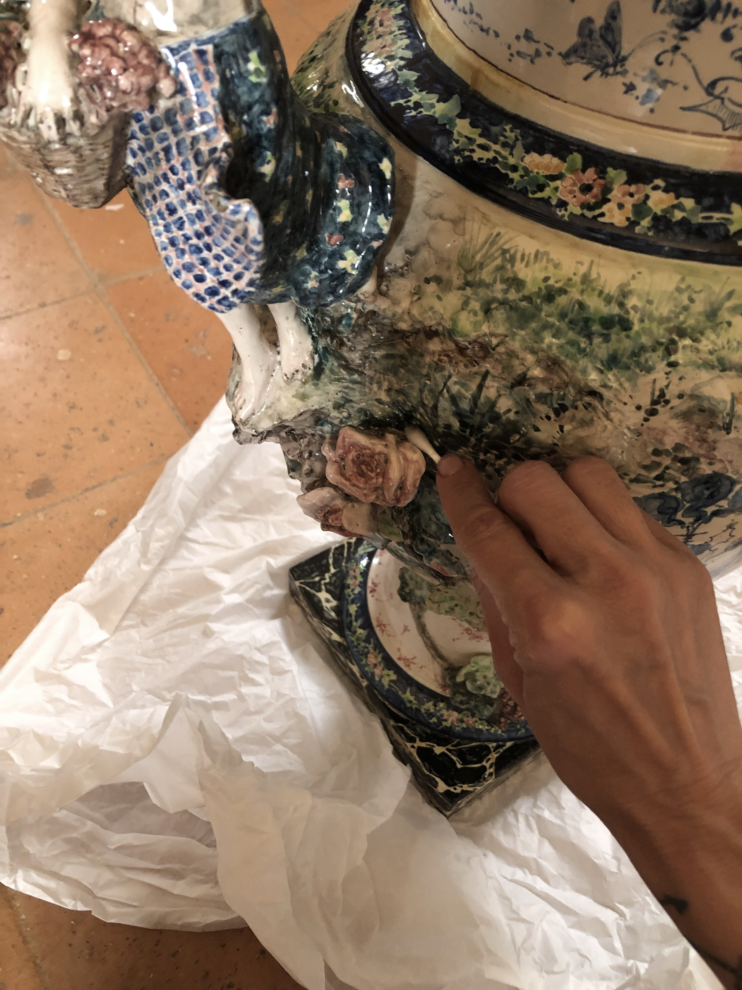 The object, rich in metaphors and allusions, comes from a patrician house in Modena and has thus been attributed to Sassuolo, but a series of studies suggests that it was produced by the Fontebasso Manufactory, the most famous and prestigious nineteenth-century ceramic producer in Treviso.