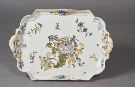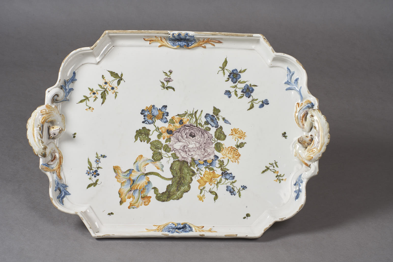 Finck remained in Sassuolo for about a year, leaving works of notable quality. The rectangular platter with rounded corners and two fox-shaped handles was probably a collaboration between him and Pietro Lei.