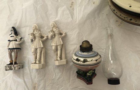 The shaving basin AN ELABORATE BEARD and the ceramic pieces for a pharmacy on the first shelf are examples of this new direction.