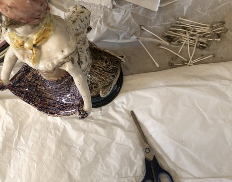 Of the three on show, one is painted in polychrome and is in a different pose. The other two, also in earthenware, bear small differences due to touches made by hand before firing, even though they came from the same mould.