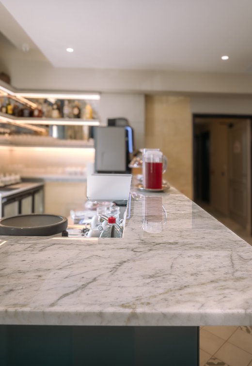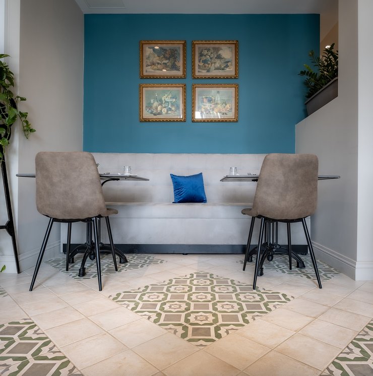 В ресторане также умело сочетаются деревенские и современные материалы, например, керамический пол в сочетании с буфетной стойкой из белого каррарского мрамора.