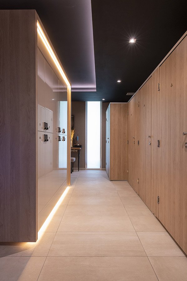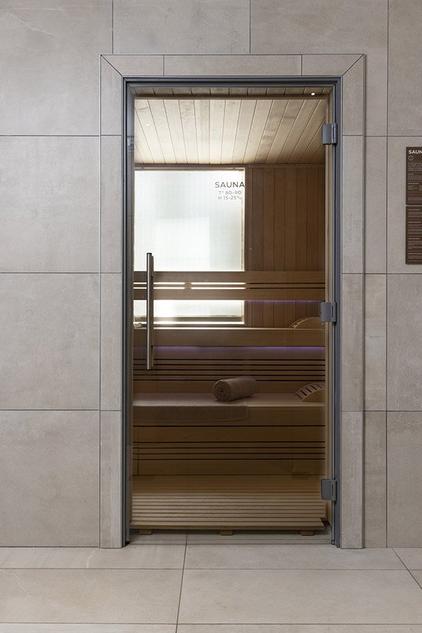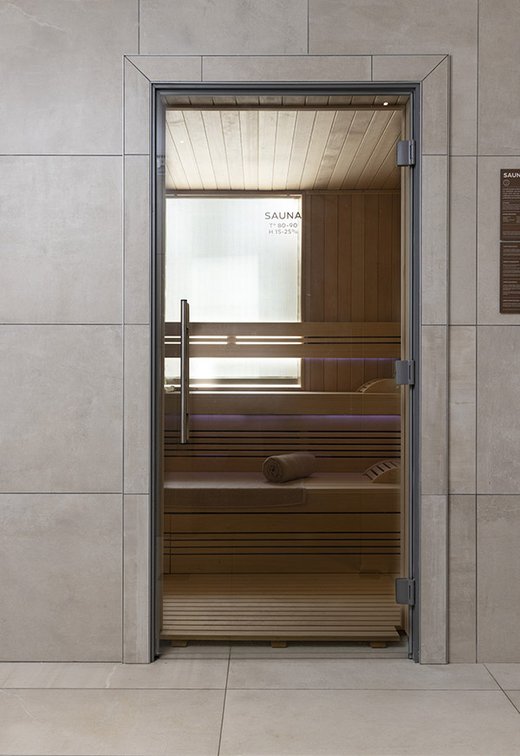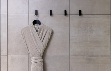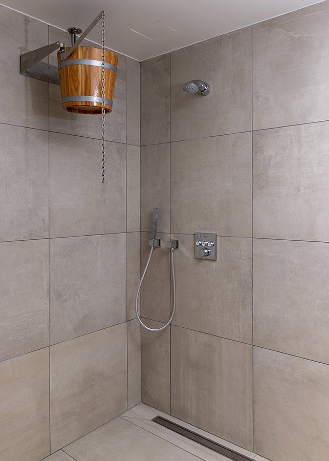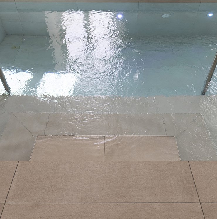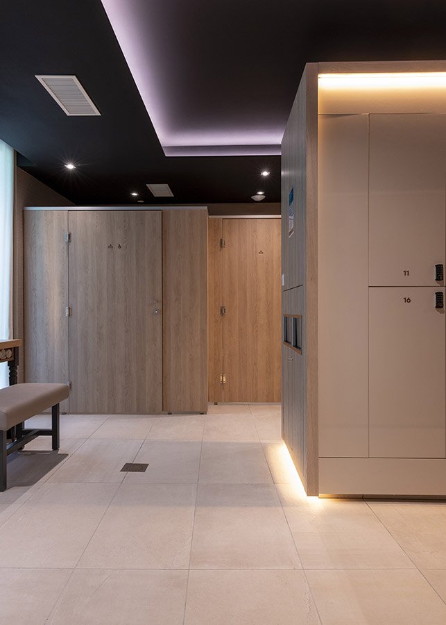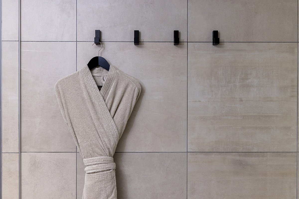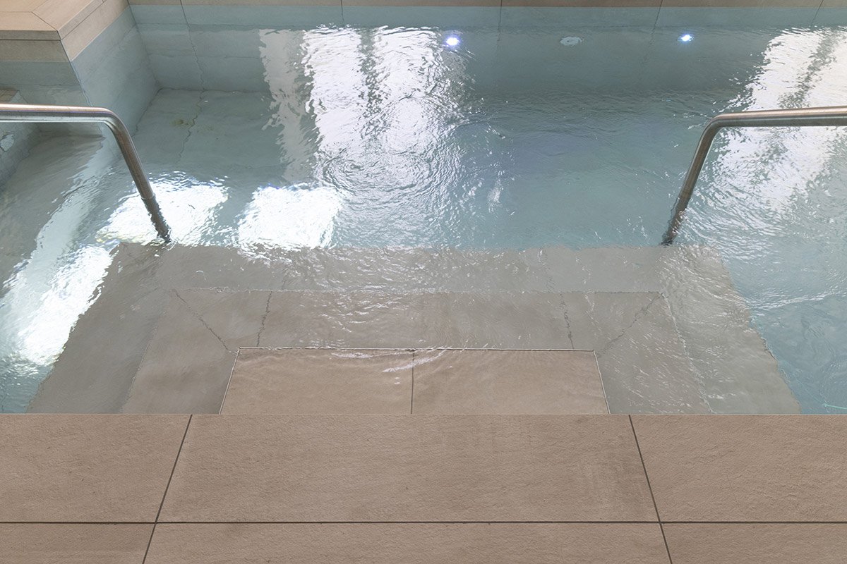 Во всем Спа-центре, от крытого бассейна до зоны релаксации, от раздевалок до душевых, в отделке можно встретить коллекцию StoneOne – напольную плитку из керамогранита с эффектом натурального камня, зрительно соединяющую все помещения. Плитка Stoneone в структурированном варианте гарантирует максимальную безопасность с точки зрения противоскольжения также и на кромке бассейна и в среде, где постоянно присутствует вода. Напольное покрытие Marca Corona также гарантирует высокую устойчивость к царапинам и ударам, максимальную практичность в уборке и безупречную гигиеничность, поскольку оно выполнено из высококачественного керамического гранита, водонепроницаемого и устойчивого к плесени и бактериям.