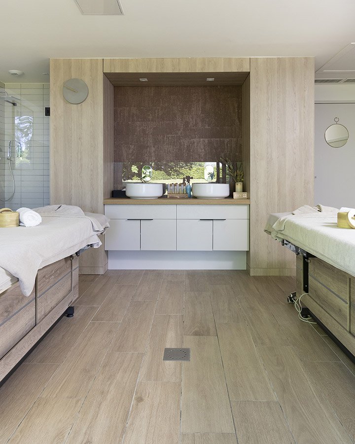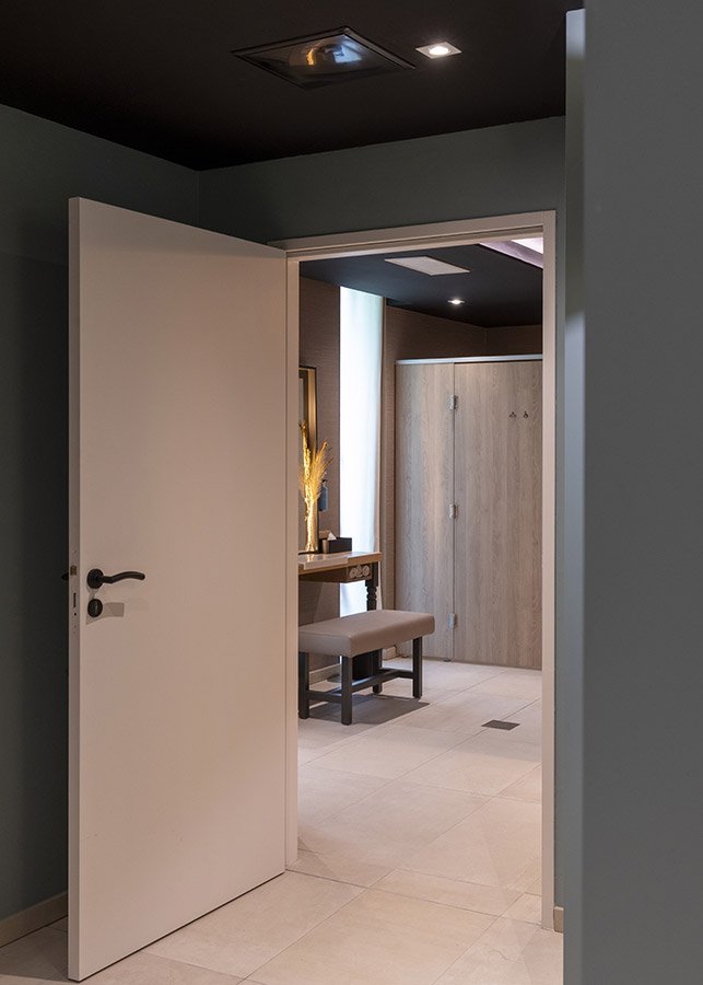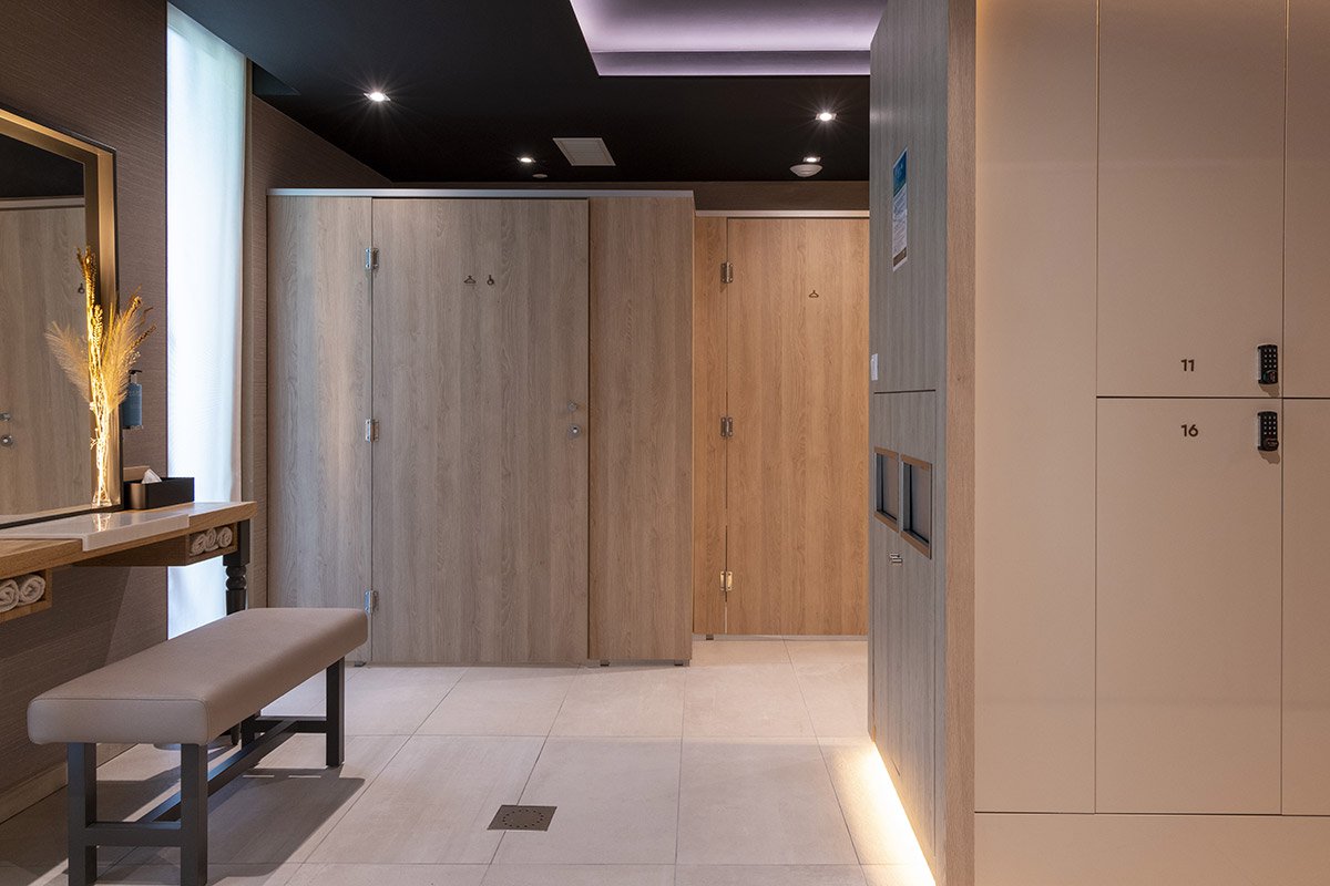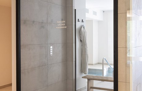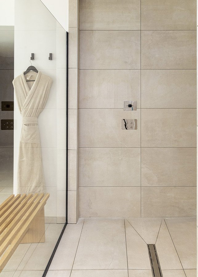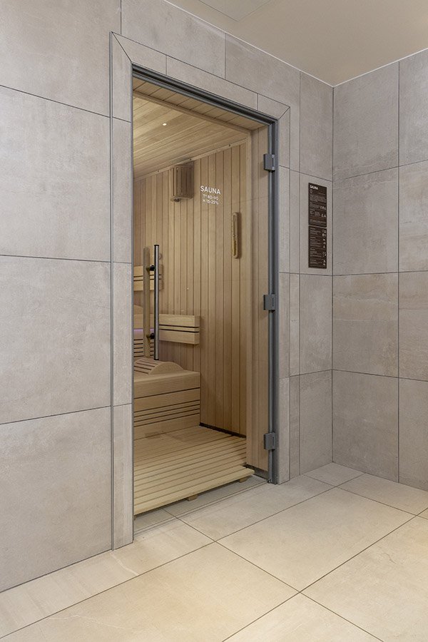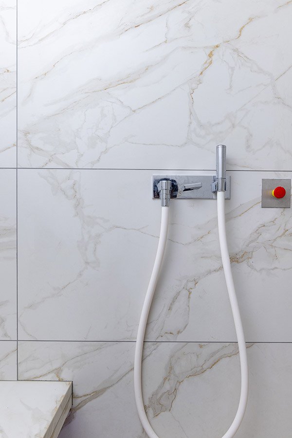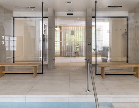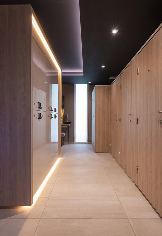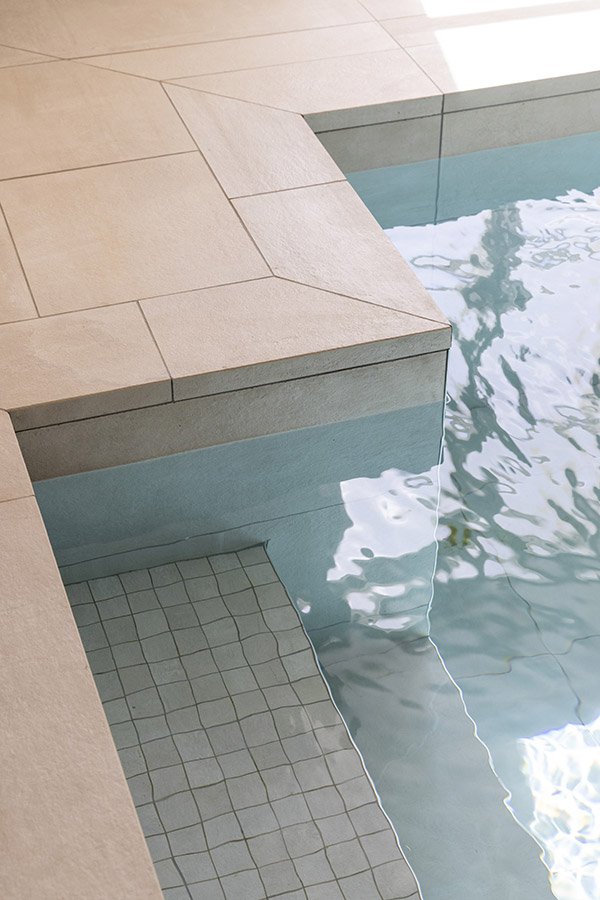 Во всем Спа-центре, от крытого бассейна до зоны релаксации, от раздевалок до душевых, в отделке можно встретить коллекцию StoneOne – напольную плитку из керамогранита с эффектом натурального камня, зрительно соединяющую все помещения. Плитка Stoneone в структурированном варианте гарантирует максимальную безопасность с точки зрения противоскольжения также и на кромке бассейна и в среде, где постоянно присутствует вода. Напольное покрытие Marca Corona также гарантирует высокую устойчивость к царапинам и ударам, максимальную практичность в уборке и безупречную гигиеничность, поскольку оно выполнено из высококачественного керамического гранита, водонепроницаемого и устойчивого к плесени и бактериям.