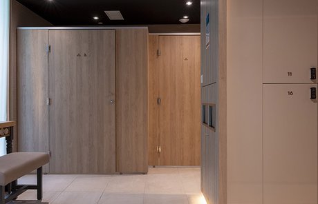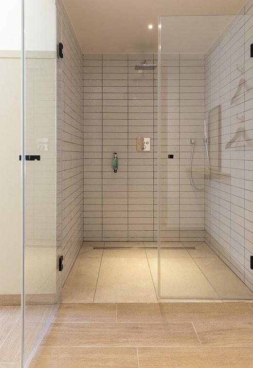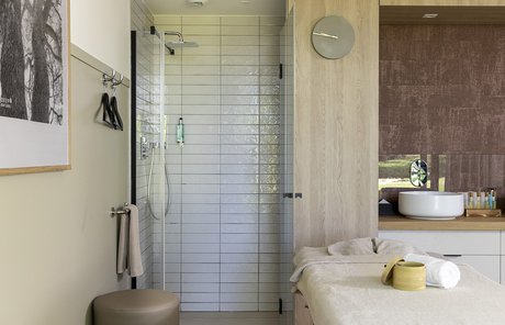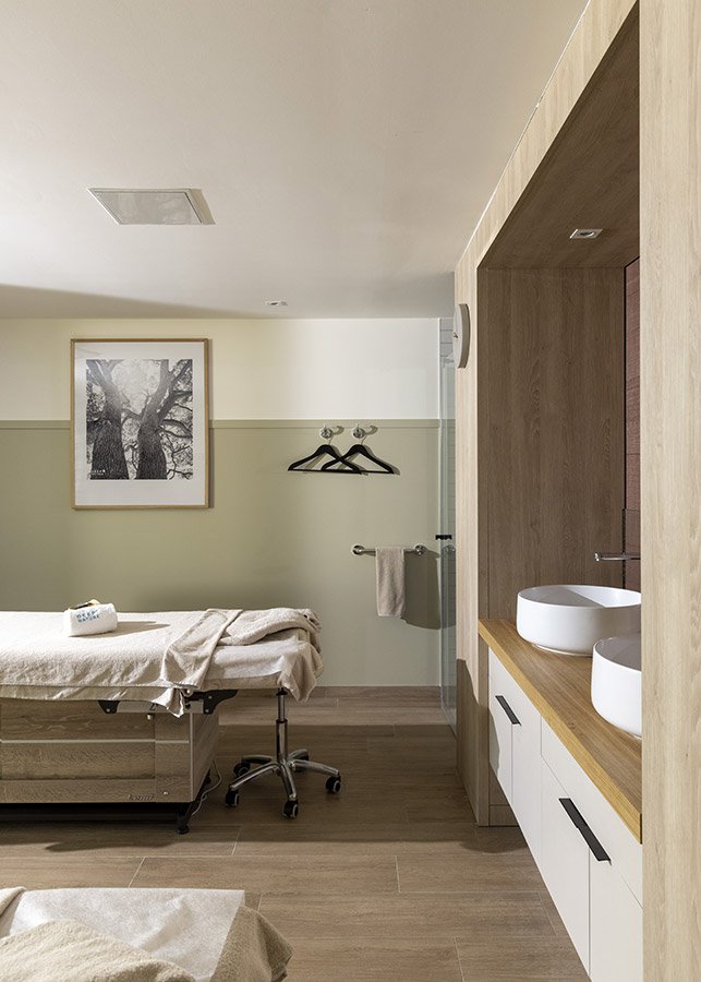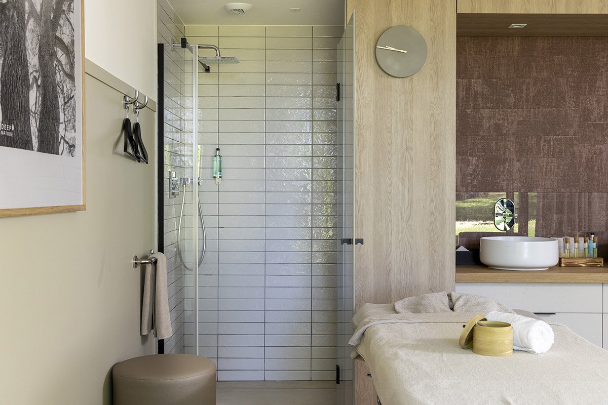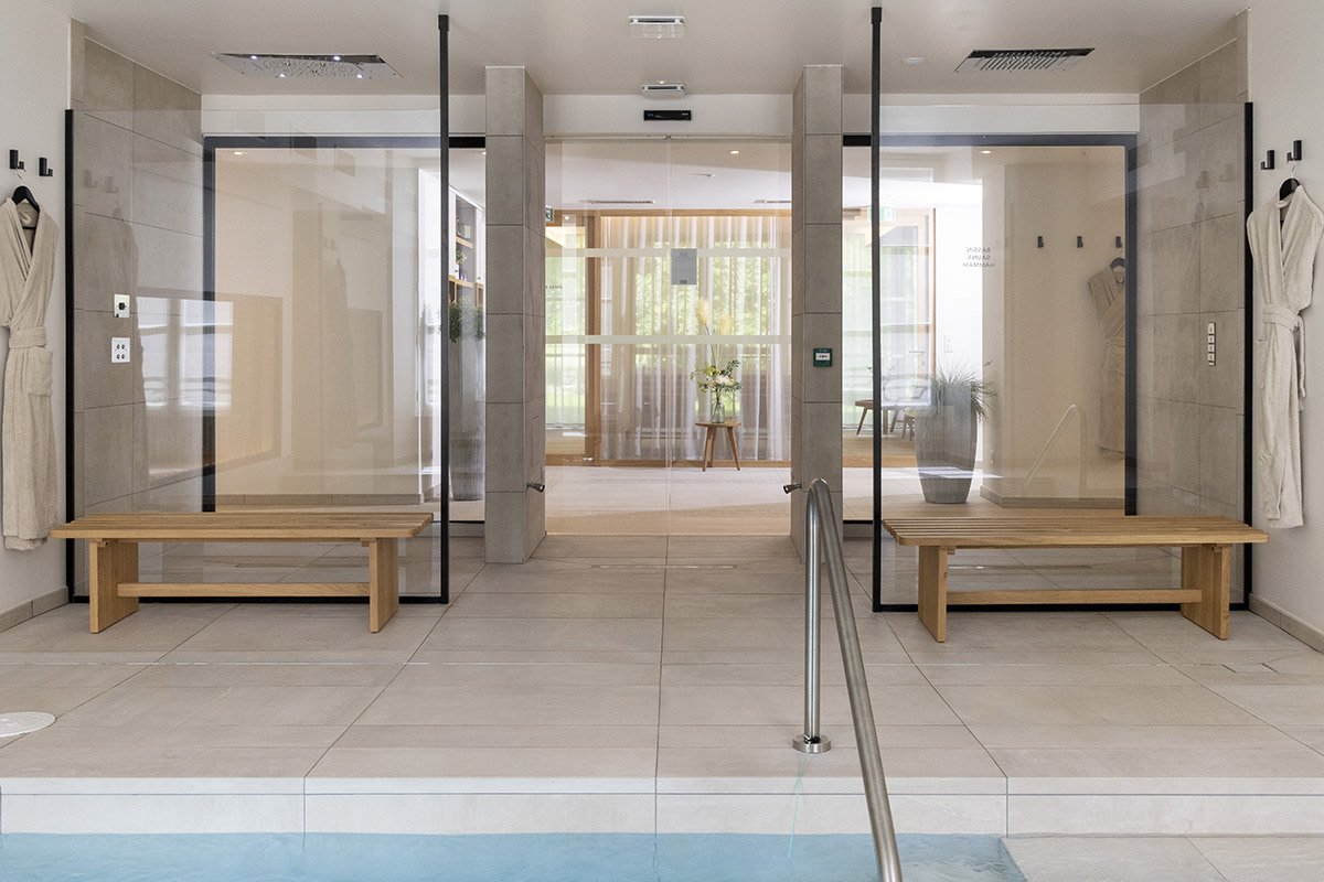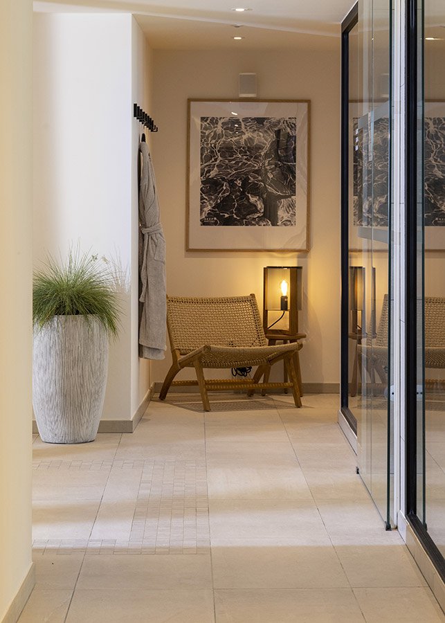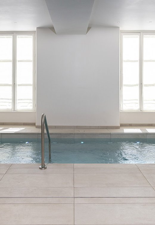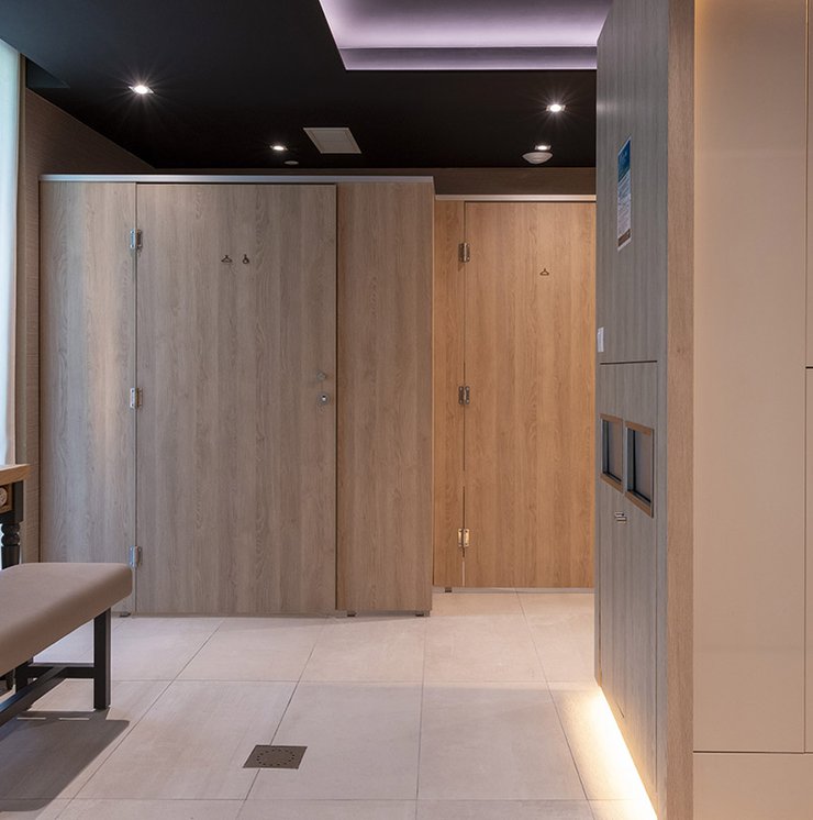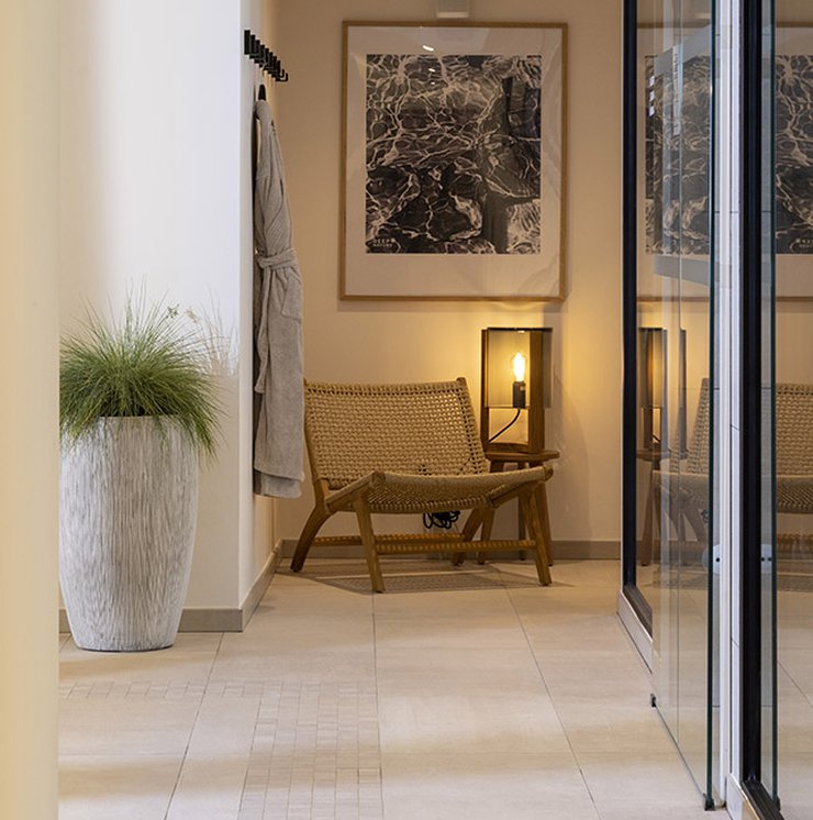 Во всем Спа-центре, от крытого бассейна до зоны релаксации, от раздевалок до душевых, в отделке можно встретить коллекцию StoneOne – напольную плитку из керамогранита с эффектом натурального камня, зрительно соединяющую все помещения. Плитка Stoneone в структурированном варианте гарантирует максимальную безопасность с точки зрения противоскольжения также и на кромке бассейна и в среде, где постоянно присутствует вода. Напольное покрытие Marca Corona также гарантирует высокую устойчивость к царапинам и ударам, максимальную практичность в уборке и безупречную гигиеничность, поскольку оно выполнено из высококачественного керамического гранита, водонепроницаемого и устойчивого к плесени и бактериям.