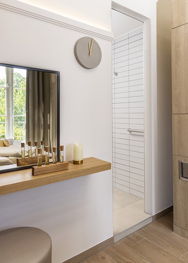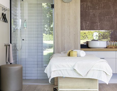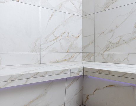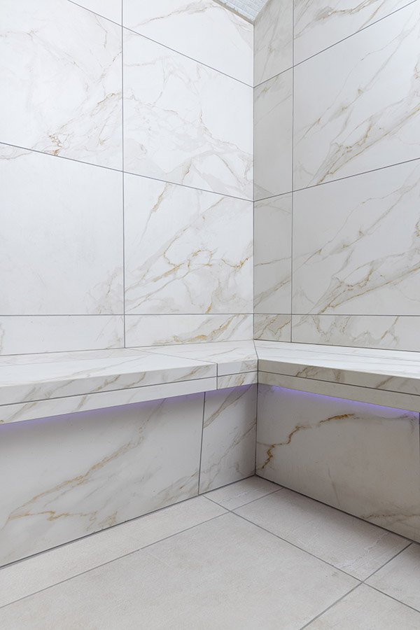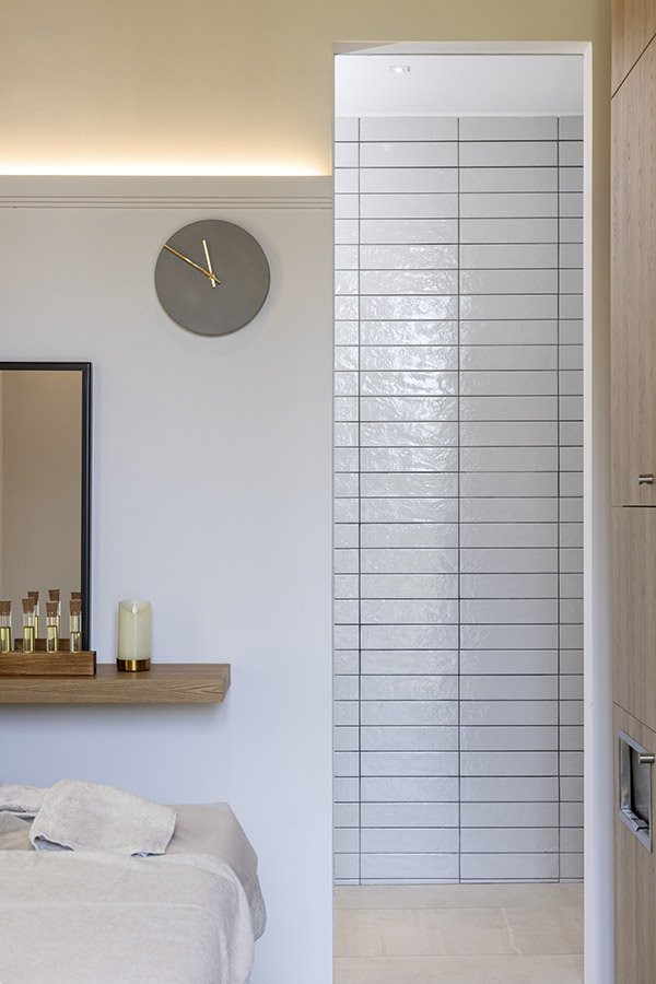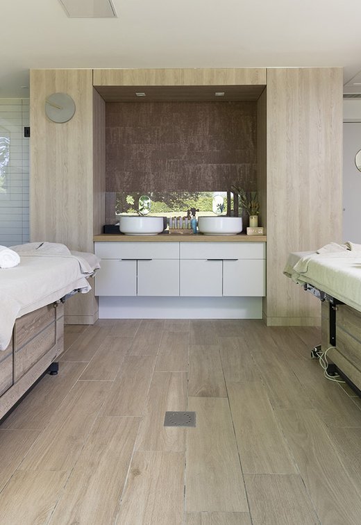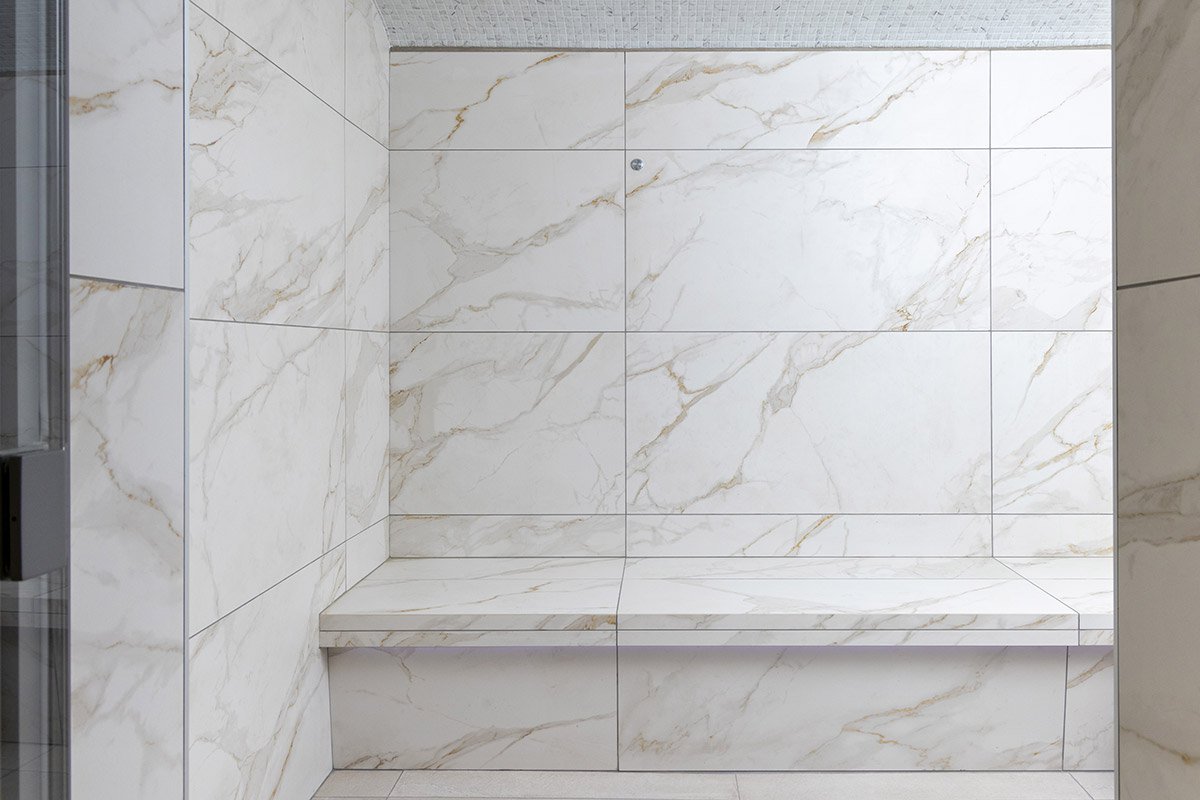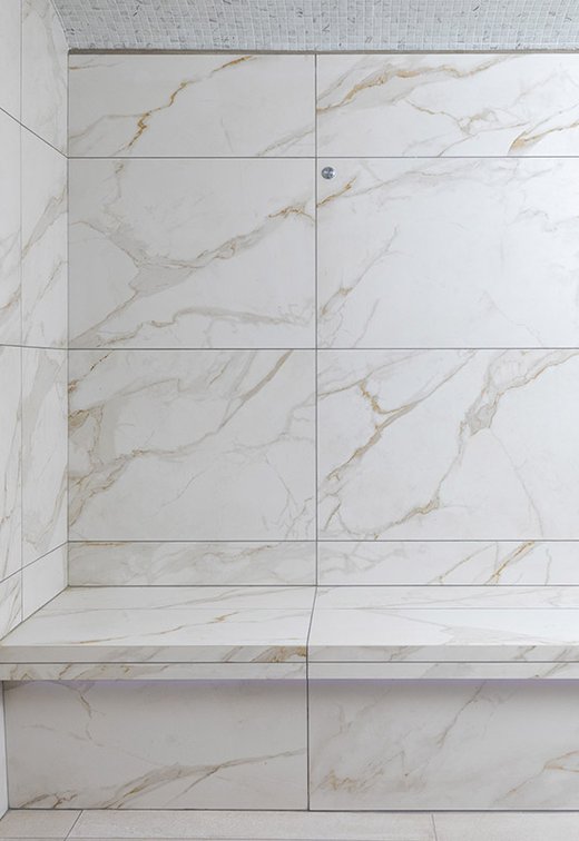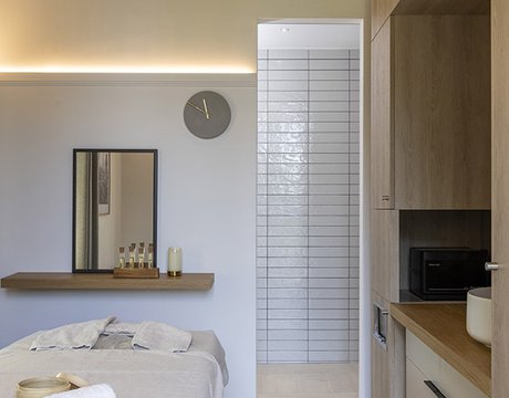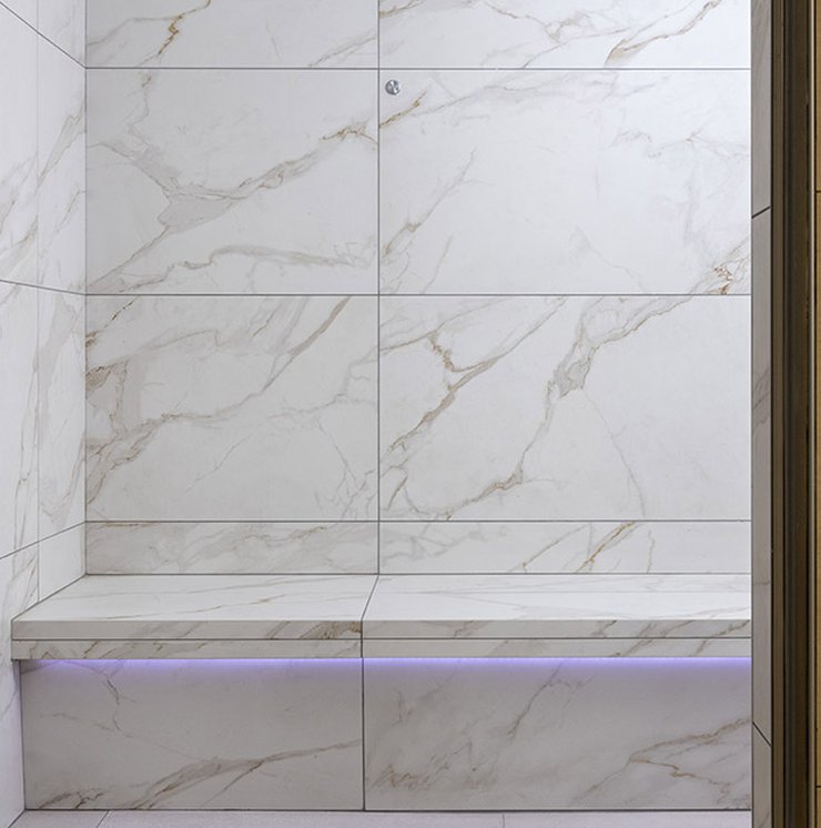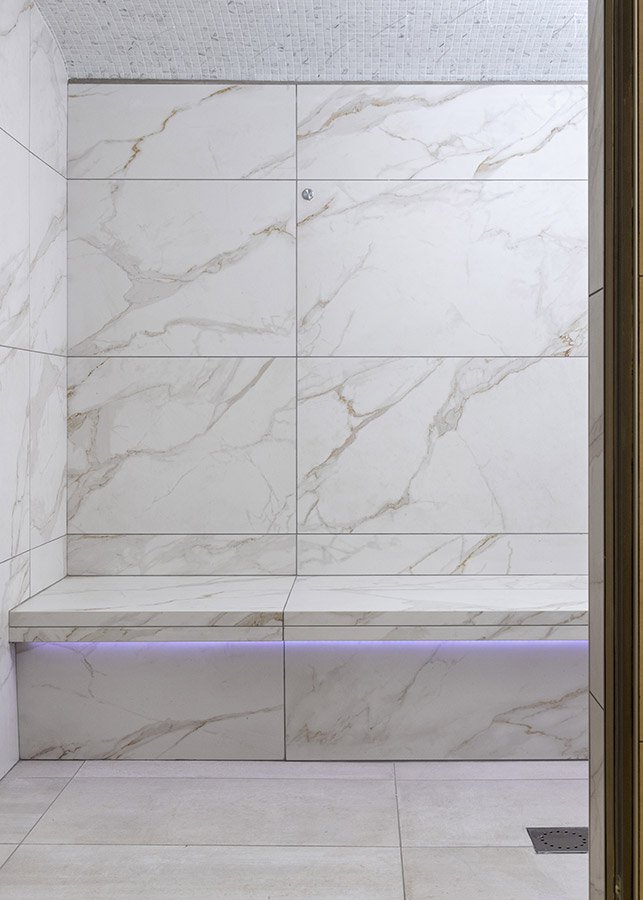 В оздоровительном центре также имеются просторные массажные кабины с уютной и гостеприимной атмосферой, создаваемой напольной плиткой с эффектом дерева Prestige, предложенной в сочетании с плиткой Regoli, актуальной серией под кирпич 7,5x30 с глазурованной отделкой «glossy». И, наконец, для придания еще более эксклюзивного характера зоне турецкой бани, была выбрана серия напольной и настенной плитки Motif Extra, с эффектом изумительно лучащегося мрамора Калакатта.