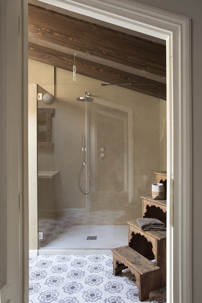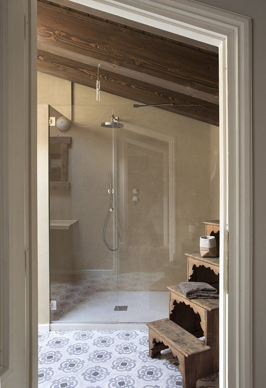 Для придания ретро-штриха, способного персонализировать и согреть весь проект, была выбрана плитка цементик Terra, флагман Линии 1741 Marca Corona: графическое и выразительное богатство этой коллекции позволило создать оригинальные цветные ковры на входе в коттедж, в ванных комнатах и в эксклюзивной таверне, сочетая различные размеры и декоры для получения неподражаемого и смелого результата!