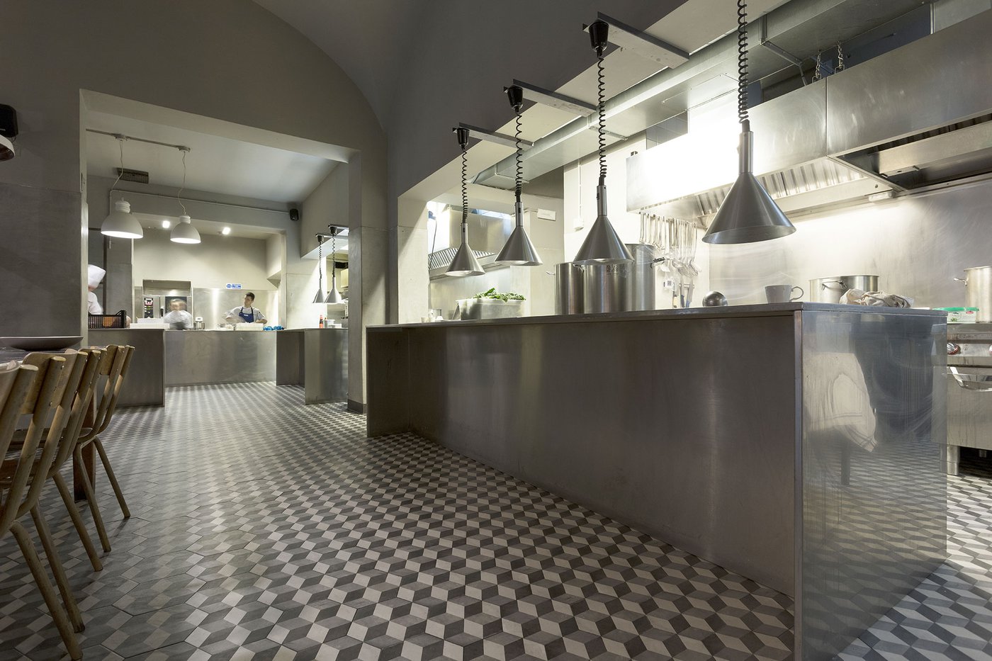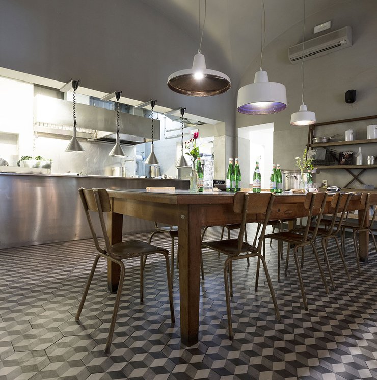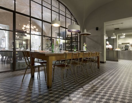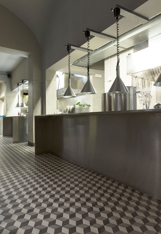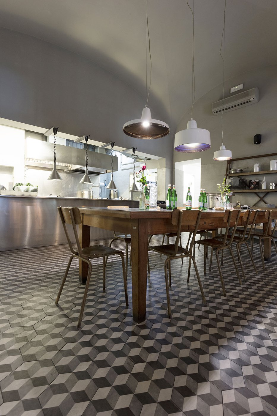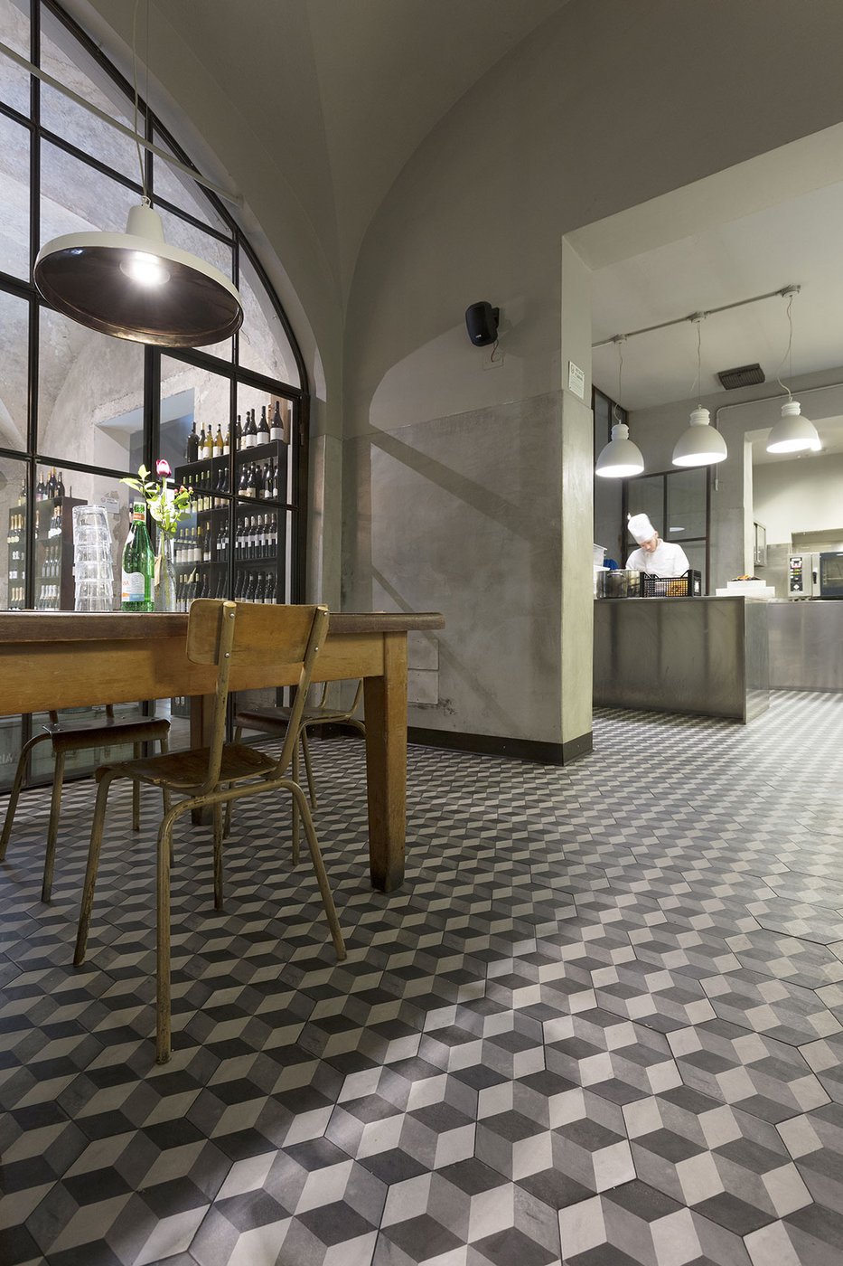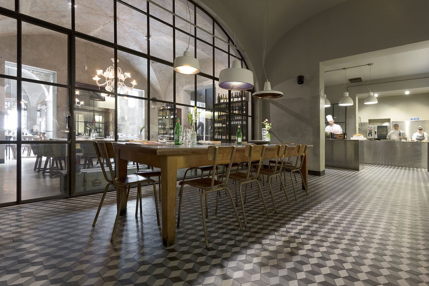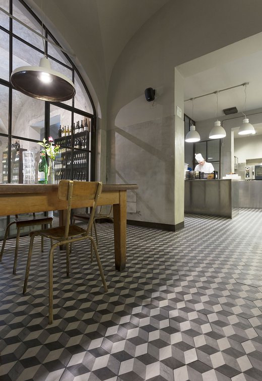 Архитекторы Балдини из студии Q-Bic положились на компанию Marca Corona в воссоздании атмосферы в классическом стиле и выбрали малоформатную плитку в пыльных тонах серии Terra. Открытая кухня, выходящая в ресторанный зал, оформлена плиткой шестиугольного формата и декором Cubo, напоминающими типичные формы и мотивы флорентийских палаццо девятнадцатого века. В зоне туалета, напротив, использована мелкая квадратная плитка с утонченным узором Astro. В сочетании с витражным остеклением в стиле «индастриал», металлическими деталями, изысканными осветительными приборами и цветочными композициями от Artemisia, плитка «cementine» серии Terra придают помещению неподдельный дизайнерских дух, всегда столь ценимый во Флоренции.