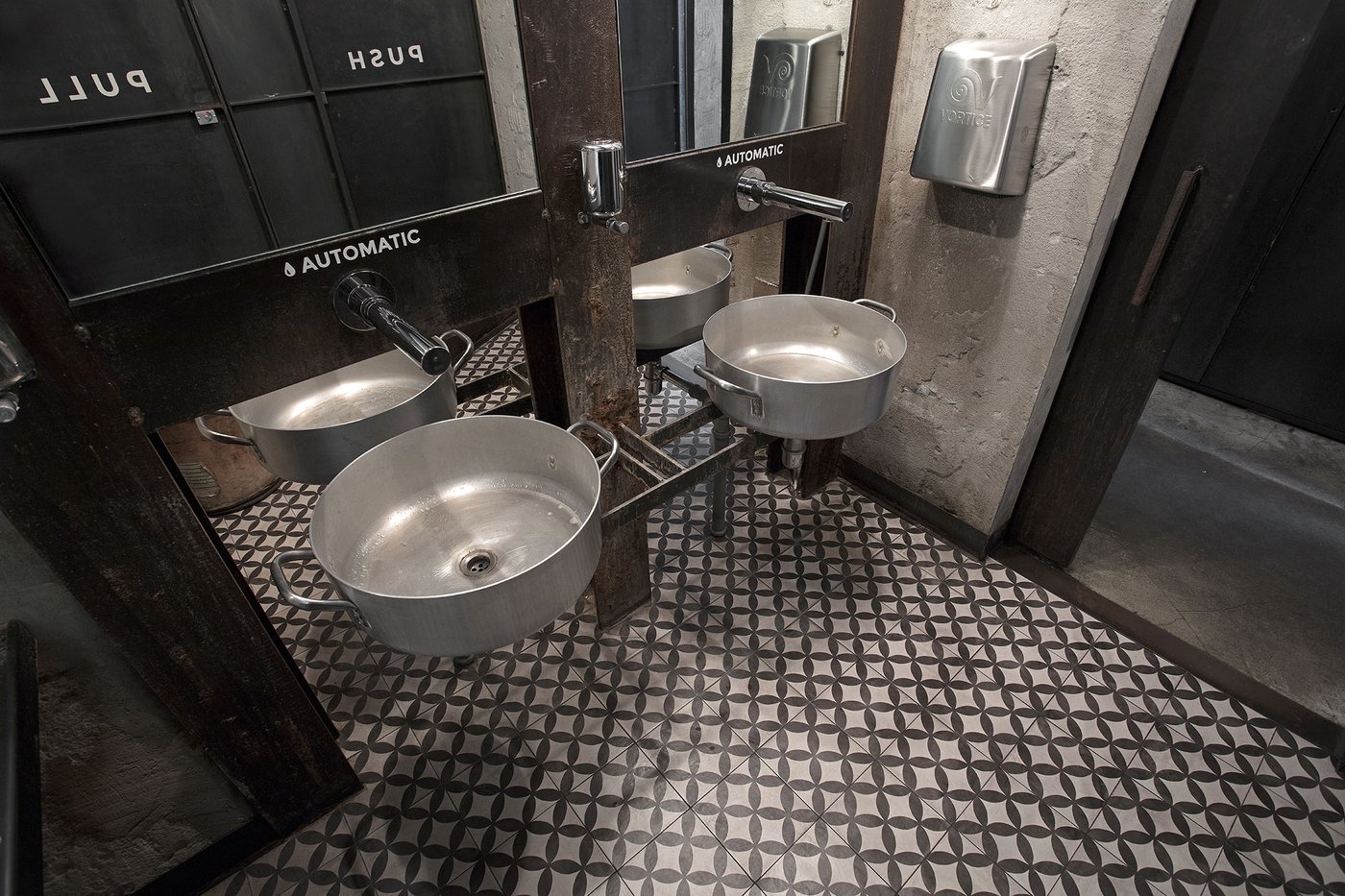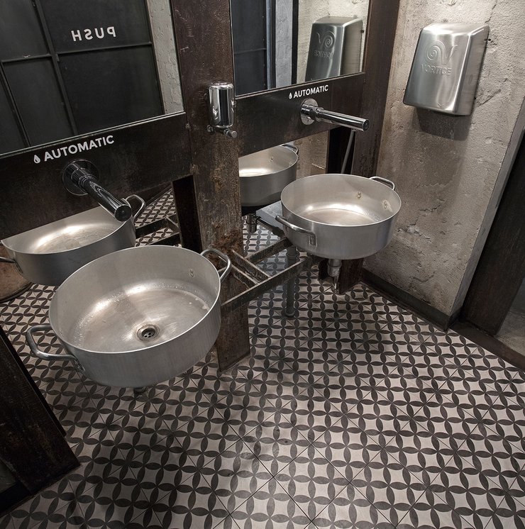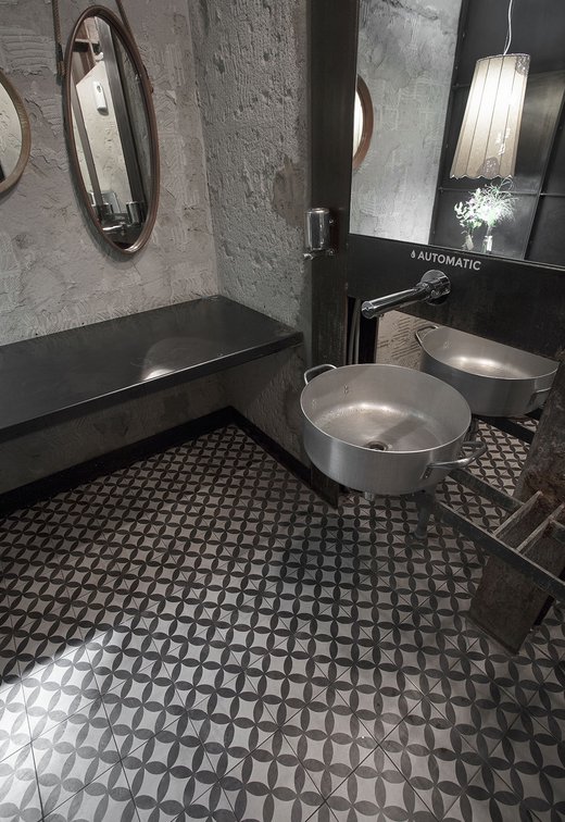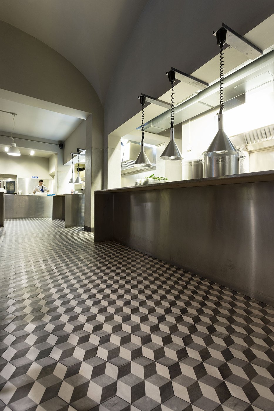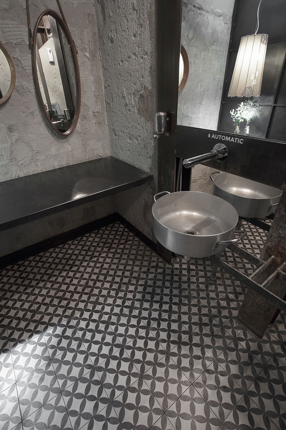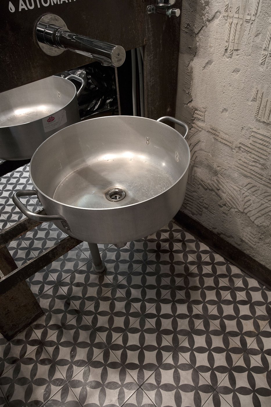 Архитекторы Балдини из студии Q-Bic положились на компанию Marca Corona в воссоздании атмосферы в классическом стиле и выбрали малоформатную плитку в пыльных тонах серии Terra. Открытая кухня, выходящая в ресторанный зал, оформлена плиткой шестиугольного формата и декором Cubo, напоминающими типичные формы и мотивы флорентийских палаццо девятнадцатого века. В зоне туалета, напротив, использована мелкая квадратная плитка с утонченным узором Astro. В сочетании с витражным остеклением в стиле «индастриал», металлическими деталями, изысканными осветительными приборами и цветочными композициями от Artemisia, плитка «cementine» серии Terra придают помещению неподдельный дизайнерских дух, всегда столь ценимый во Флоренции.