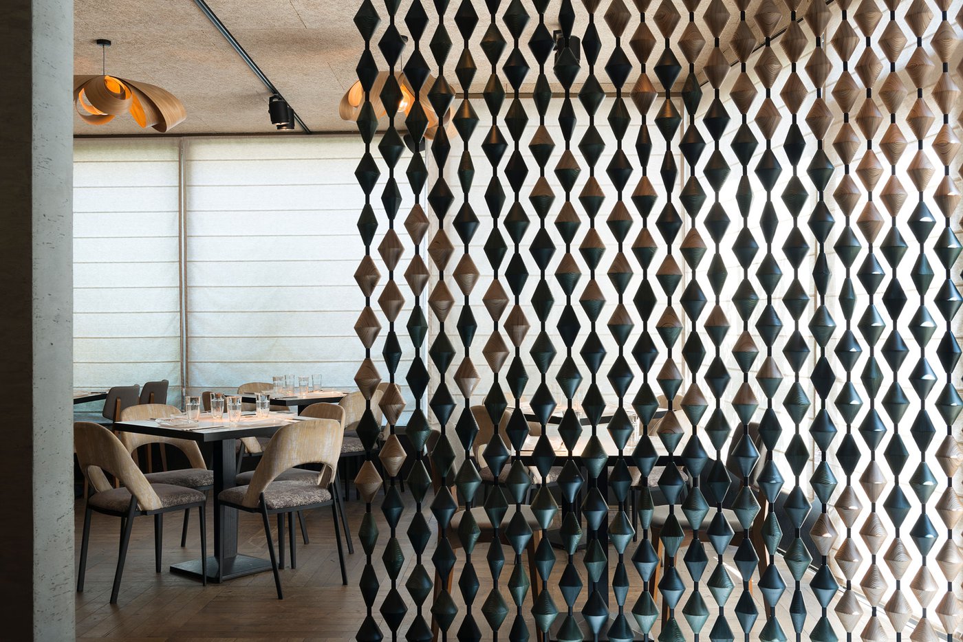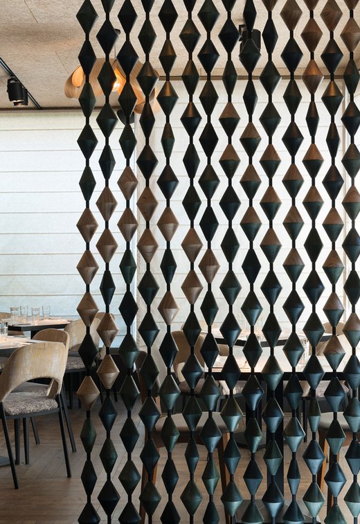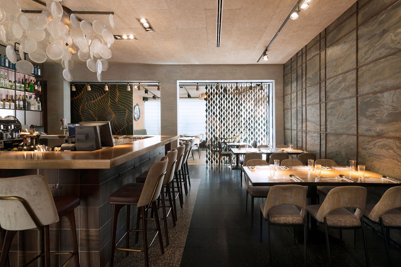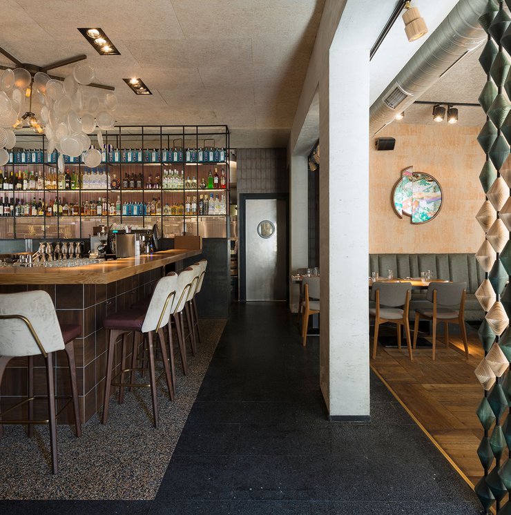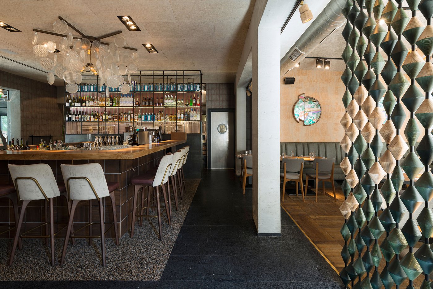 В этом элегантном ресторане гостей встречает облицовка Textile, представляющая современное смешение фактур цемента и ткани. Вариант Taupe и металлические элементы отделки создают приятную цветовую игру с флористическими композициями. В основном холле высокие сиденья, помпезные люстры и ультра-гламурные перегородки вступают в диалог с плиткой Essences - еще одной жемчужиной коллекции Linea 1741: квадратная плитка под дерево 20x20 в варианте Iroko покрывает всю стойку бара. Декор изысканно завершает трехмерная плитка из коллекции 4D, которая использована также и в облицовке санузлов в утонченном синем оттенке.