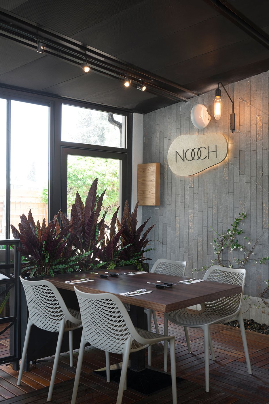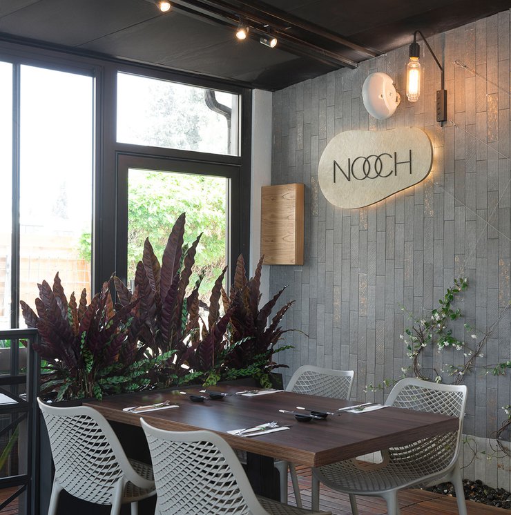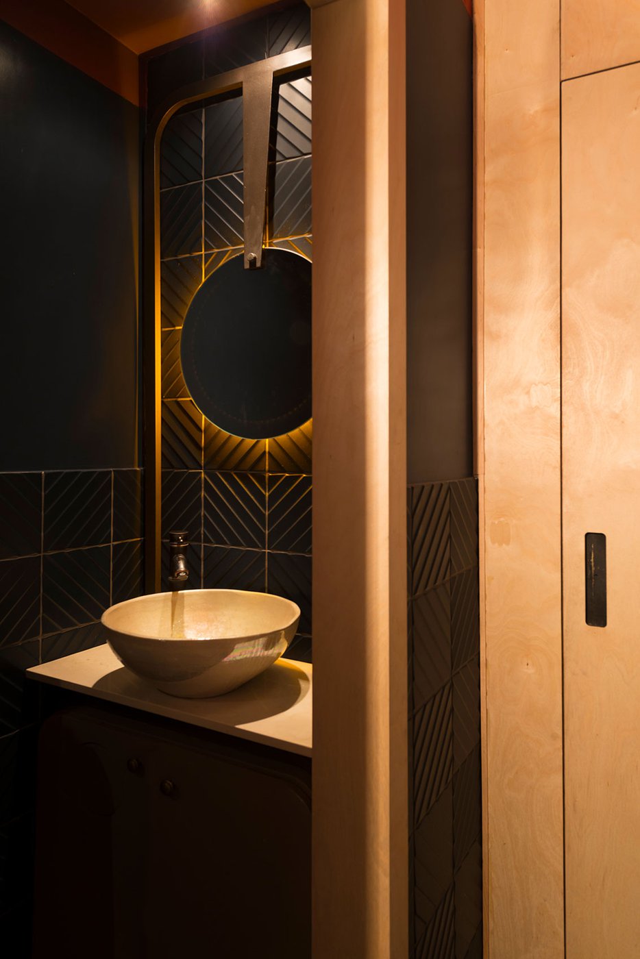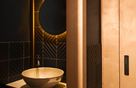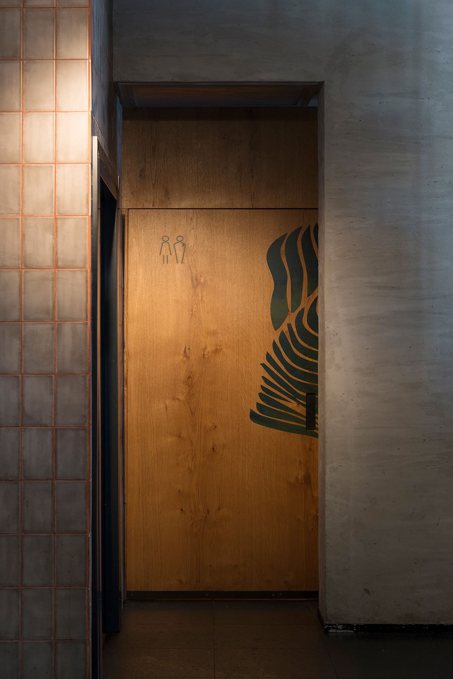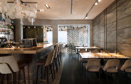 В этом элегантном ресторане гостей встречает облицовка Textile, представляющая современное смешение фактур цемента и ткани. Вариант Taupe и металлические элементы отделки создают приятную цветовую игру с флористическими композициями. В основном холле высокие сиденья, помпезные люстры и ультра-гламурные перегородки вступают в диалог с плиткой Essences - еще одной жемчужиной коллекции Linea 1741: квадратная плитка под дерево 20x20 в варианте Iroko покрывает всю стойку бара. Декор изысканно завершает трехмерная плитка из коллекции 4D, которая использована также и в облицовке санузлов в утонченном синем оттенке.