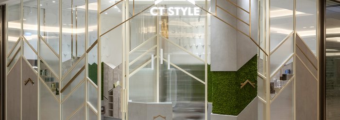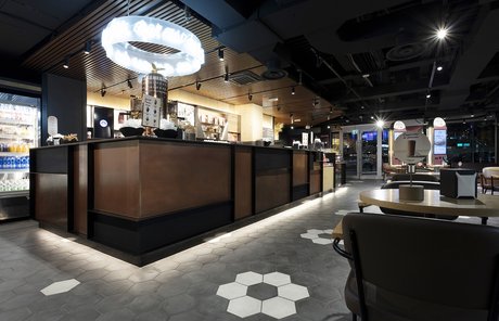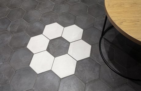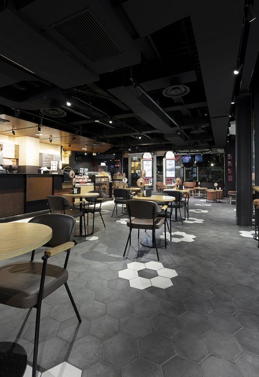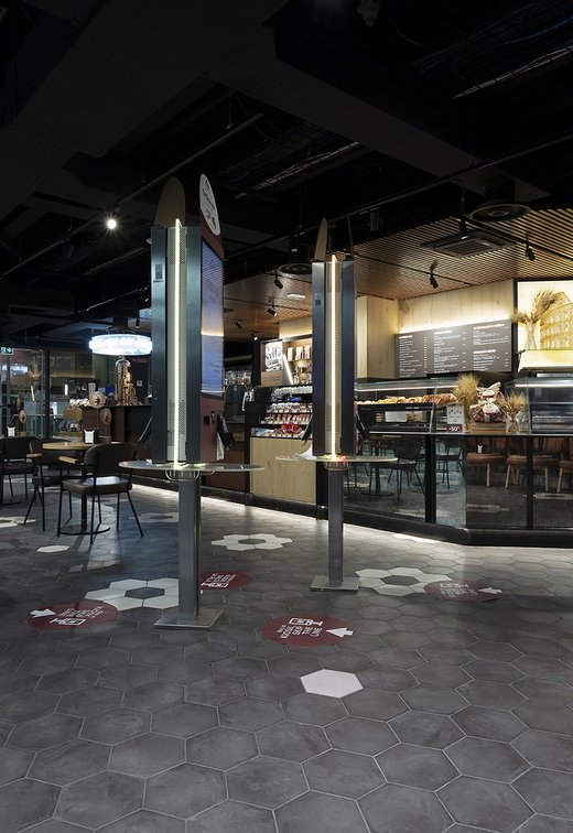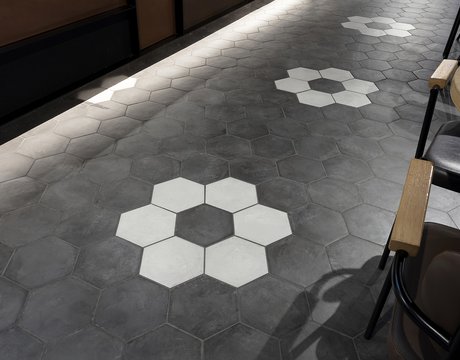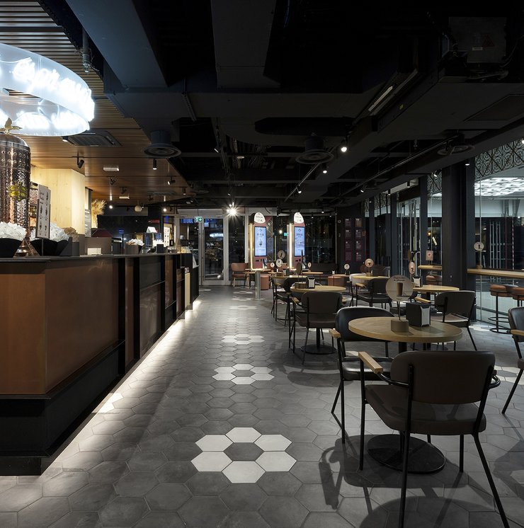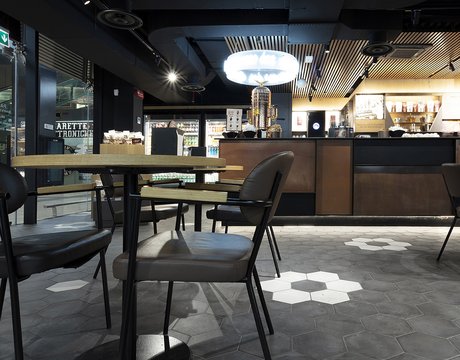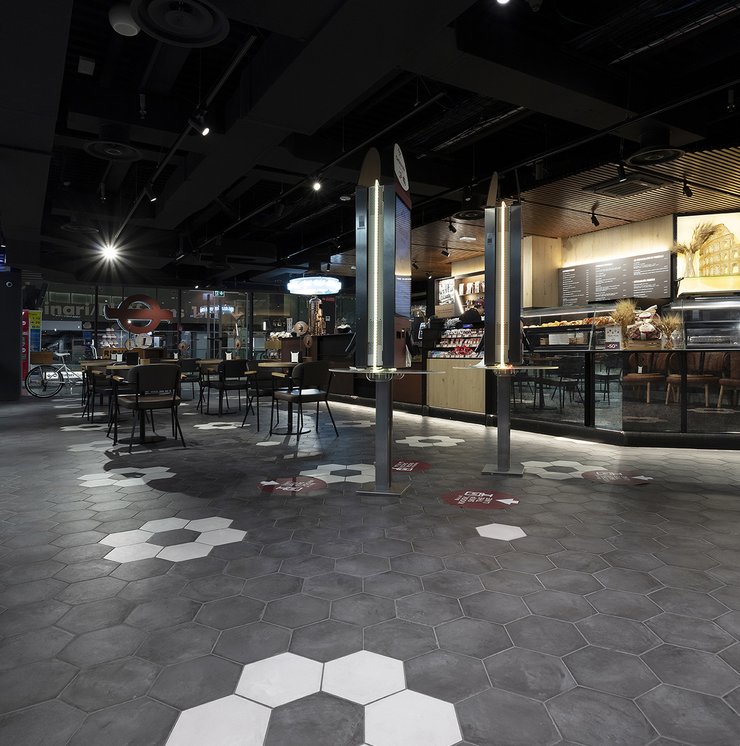 Для полов кафе и главной фокусной точки была выбрана коллекция керамогранитной плитки цементик Terra - бесспорно, оптимальное решение для особенно оживленной обстановки: устойчивость этого материала к истиранию делает его идеальным для общественных мест, посещаемых большим количеством людей, гарантируя при этом легкость уборки и ухода без пренебрежения эстетикой и практичностью.