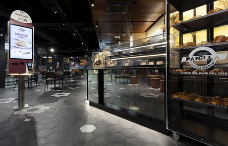 Коллекция имеет безошибочно узнаваемый дизайн в стиле ретро, играя с шестиугольными формами на нейтральных тонах: эта особенность придает пространству неформальный и гостеприимный вид, при этом не отвлекая излишнее внимание от настоящего сердца Panella - пекарни/бара.