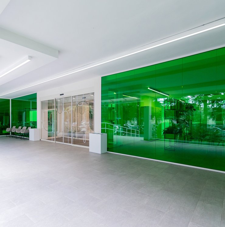 Эта логика воплощается в выборе отделок и материалов, привлекательных с эстетической точки зрения и высокоэффективных с технической. Для оформления таких зон отдыха, как портик, и для лестниц используются керамогранитные плиты Arkistone серебристого цвета silver - нейтрального и благородного оттенка, который прекрасно сочетается с мебелью из натурального дерева, а также зелеными и оранжевыми тонами, выбранными для придания помещениям яркого, живого и стимулирующего характера.