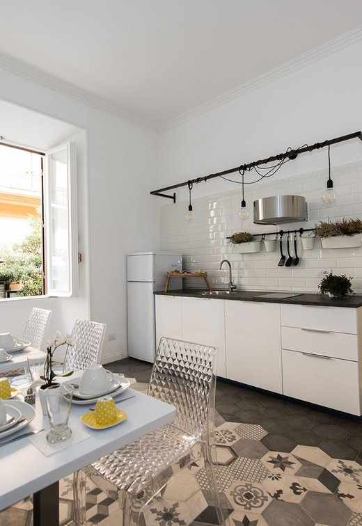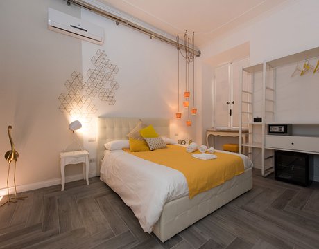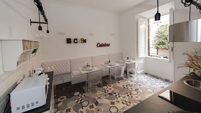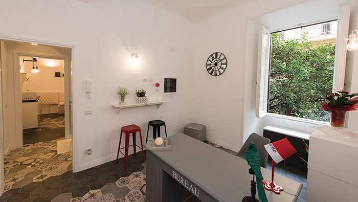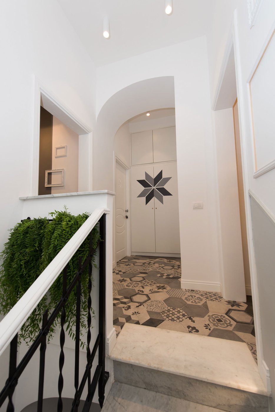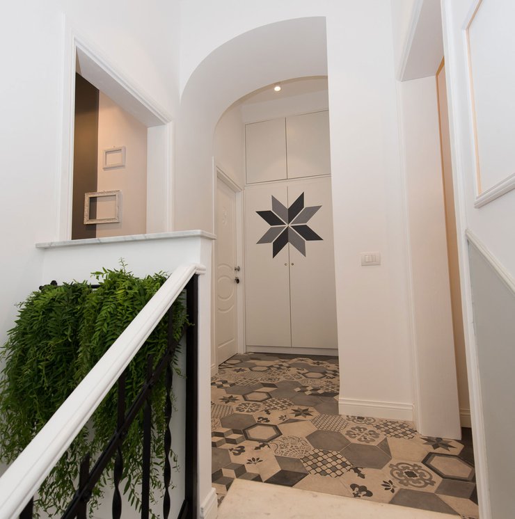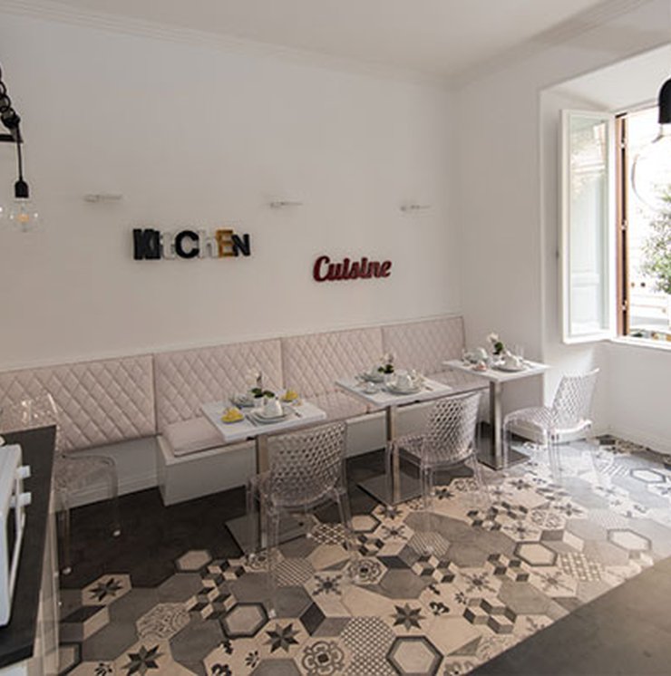 Небольшой бутик-отель недалеко от Вилла Боргезе в Риме, современная и неформальная атмосфера благодаря интерьеру в минималистском стиле, ярким цветовым штрихам и декорированной плитке «cementine» серии Terra. Шестиугольная плитка производства компании Marca Corona встречает гостей у самого входа и сопровождает их по всему зданию. У стойки администратора, на общей кухне и в коридорах, ведущих в частные номера мы видим оригинальные геометрические рисунки коллекции Mix Decori, обрамленные элегантным фоном серии Nero и Antracite.